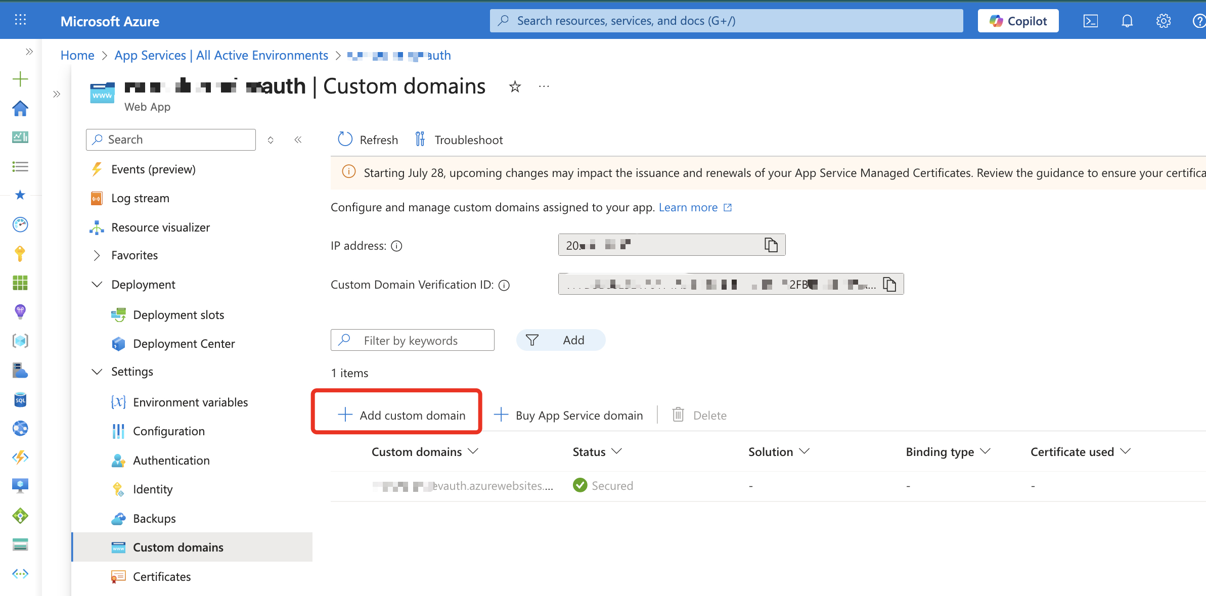 เมื่อเราตั้งค่า Cloudflare DNS เป็น DNS only แล้ว เราก็ไปตั้งค่า Custom Domain ใน Azure App Service หรือ Container App ได้เลย พอ Azure ตรวจสอบความเป็นเจ้าของโดเมนเสร็จแล้ว เราก็กลับมาเปลี่ยน Cloudflare เป็น Proxy Mode ได้เลย