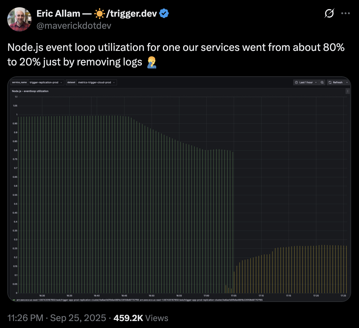 Ref: Node.js event loop utilization for one our services went from about 80% to 20% just by removing logs by @maverickdotdev 🤦https://x.com/maverickdotdev/status/1971249969463165313